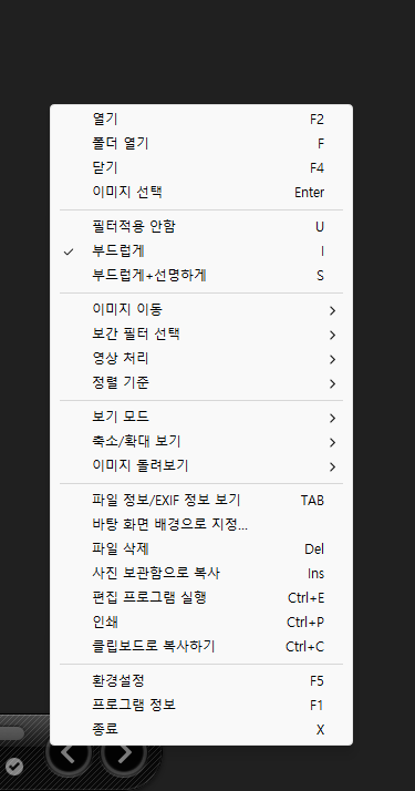 우클릭하면 열기, 폴더 열기, 닫기 같은 기본 기능 외에 필터 설정(부드럽게, 부드럽게+선명하게), 이미지 이동, 보간 필터 선택, 영상 처리, 정렬 기준, 보기 모드, 파일 정보/EXIF 정보 보기 등에 접근할 수 있습니다. 특히 "정렬 기준"은 만화책 볼 때 이미지 순서에 직접 영향을 주기 때문에 꼭 확인해야 합니다.