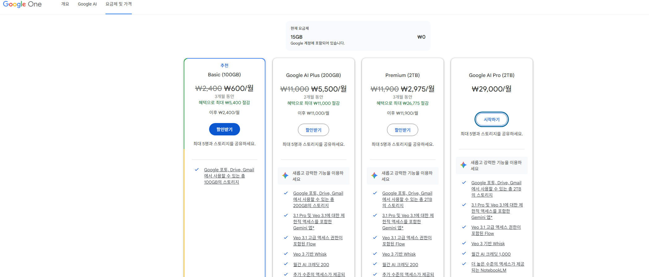 추천 플랜: 무료 15GB로 시작 → 부족하면 Google One 100GB(월 2,500원)