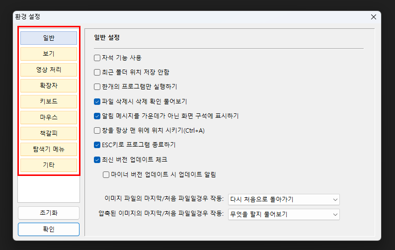 F5를 누르면 환경 설정 창이 열립니다. 여기서 일반, 보기, 영상 처리, 확장자, 키보드, 마우스, 책갈피, 탐색기 메뉴, 기타 탭으로 나뉘어 있습니다.