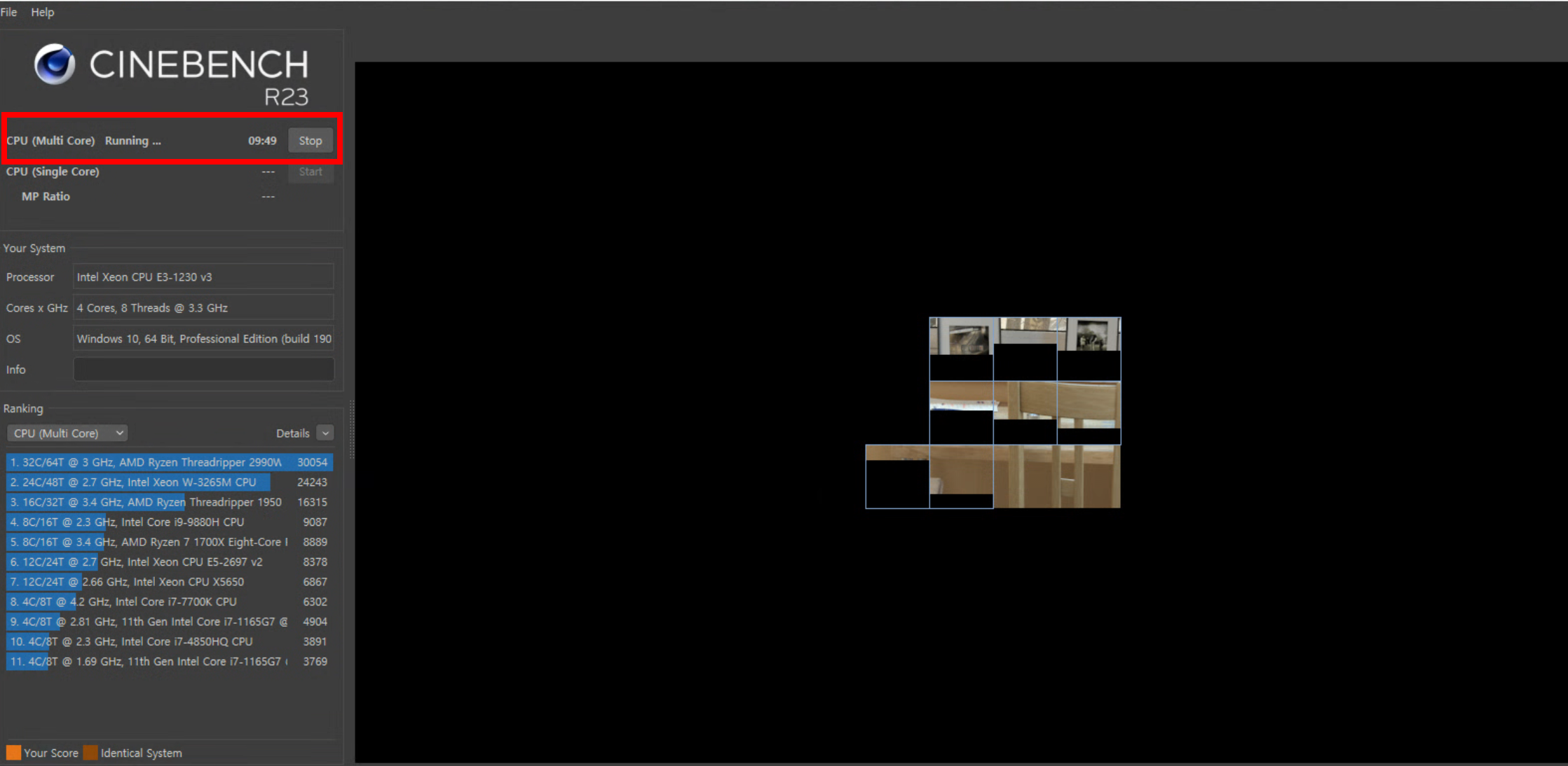 테스트가 시작되면 오른쪽 영역에 3D 이미지가 조각조각 렌더링되는 것이 보입니다. 멀티코어 테스트에서는 CPU의 각 스레드가 하나의 사각형 블록을 담당해서 동시에 그림을 그려나갑니다. 싱글코어 테스트에서는 코어 하나만 동원되니 렌더링이 훨씬 느리게 진행됩니다.