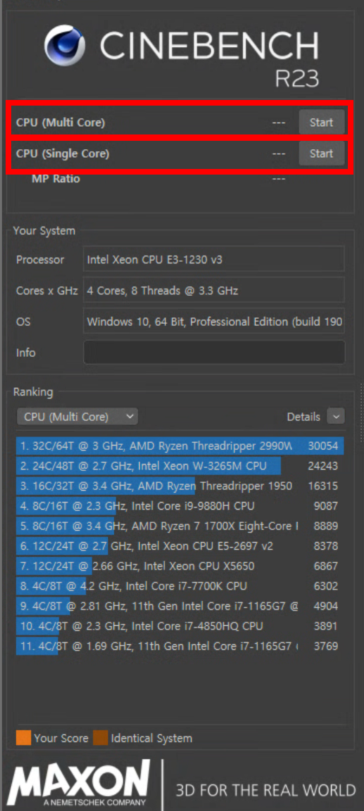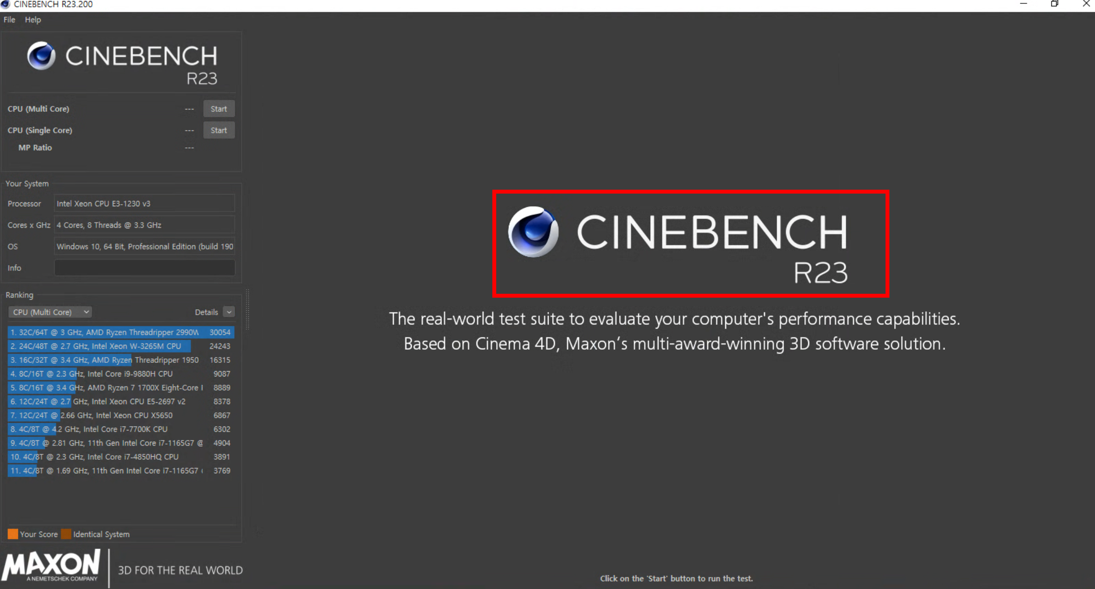 시네벤치 R23은 Maxon의 3D 렌더링 소프트웨어 Cinema 4D R23의 렌더링 엔진을 기반으로 CPU 성능을 측정하는 프로그램입니다. 쉽게 말하면, 복잡한 3D 이미지를 CPU가 얼마나 빨리 그려내느냐를 측정해서 점수로 매기는 방식입니다.