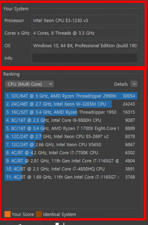 테스트가 끝나면 왼쪽에 점수가 표시되고, 하단의 Ranking 목록에서 내 CPU가 대략 어느 위치인지 확인할 수 있습니다. 하지만 이 내장 랭킹은 CPU 종류가 한정적이라, 더 정확한 비교를 하려면 온라인 데이터베이스를 참고하는 게 좋습니다.