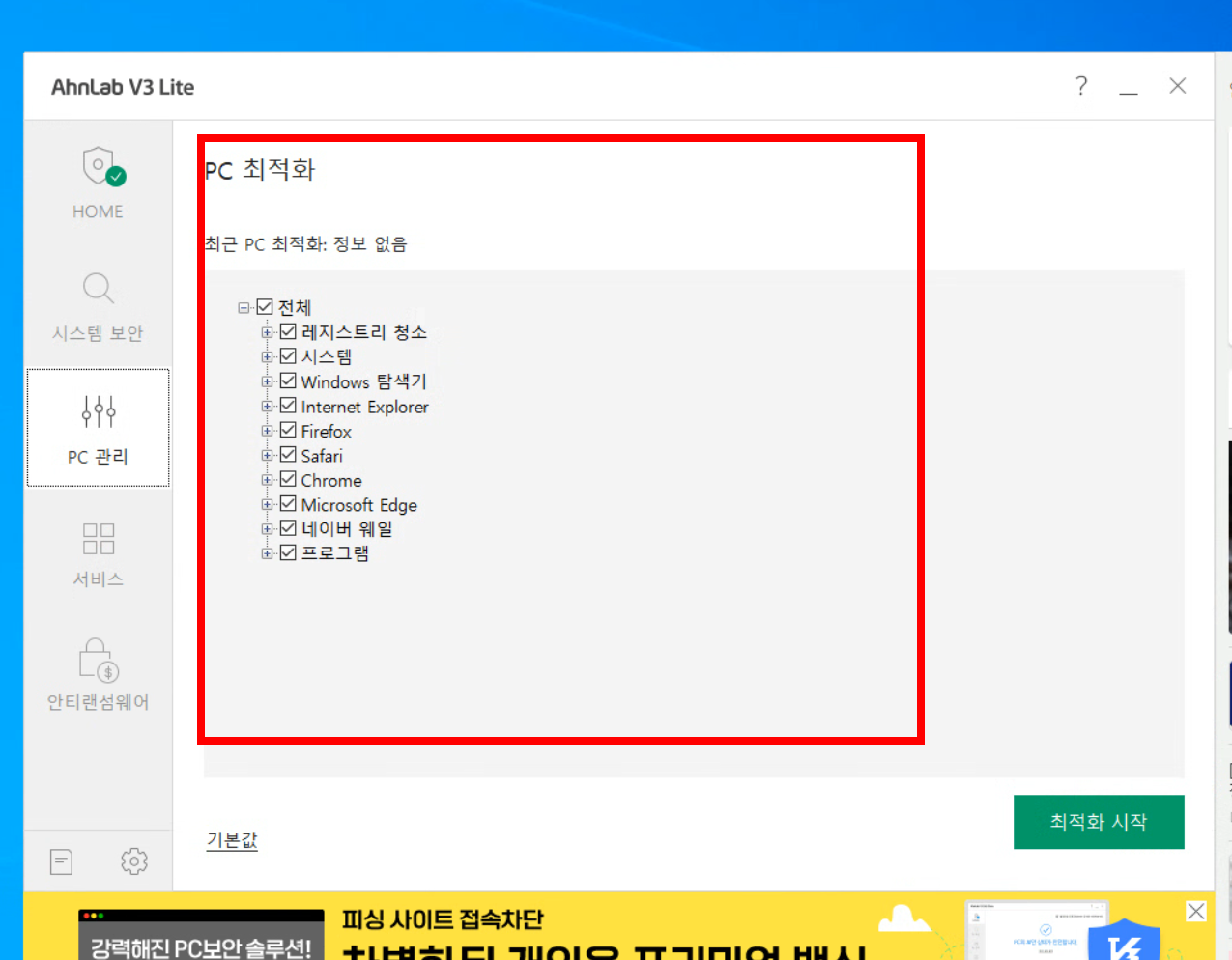 셋째, 원클릭 검사와 PC 최적화입니다. 버튼 하나로 악성코드 검사와 시스템 정리를 동시에 돌릴 수 있습니다. 레지스트리 정리, 임시 파일 삭제, 캐시 정리 같은 기본적인 최적화 기능이 포함되어 있습니다. 솔직히 전문 클리너 프로그램에 비할 수준은 아니지만, 백신에 딸려 있는 부가 기능 치고는 괜찮습니다. 따로 클리너를 설치하기 귀찮은 분들에게는 편리합니다.