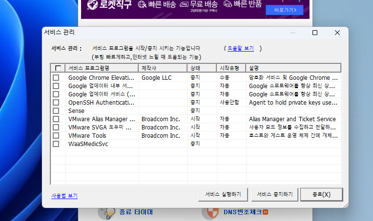 목록에 뜨는 항목 중 꼭 필요한 드라이버가 아니라면 체크해서 서비스 중지를 눌러주세요. 부팅 시간이 획기적으로 단축되는 것을 체감할 수 있습니다.