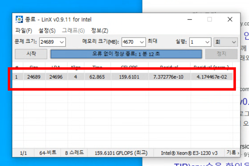 테스트 중에는 브라우저, 메신저 등 다른 프로그램을 전부 닫으세요. CPU 점유를 100% 유지해야 정확한 결과가 나옵니다. 백그라운드에서 뭔가 돌아가면 GFlops 값이 튀어서 정상적인 결과 판독이 어려워집니다.