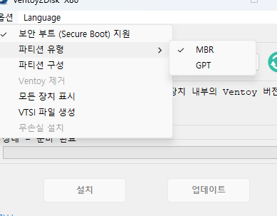 (옵션 → 파티션 유형에서 MBR과 GPT를 선택하는 메뉴.)