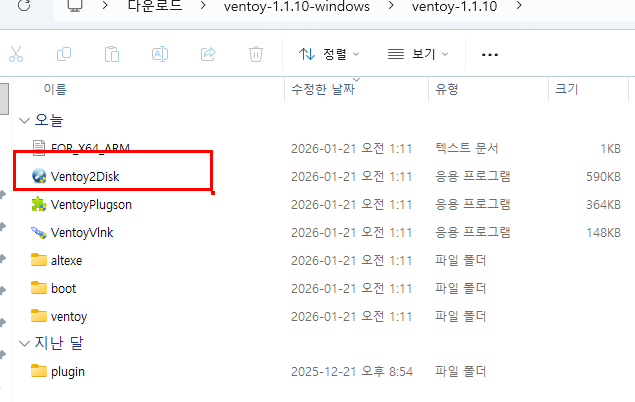 (압축을 풀면 나오는 파일 목록. Ventoy2Disk 실행 파일을 빨간 네모로 표시했습니다.)