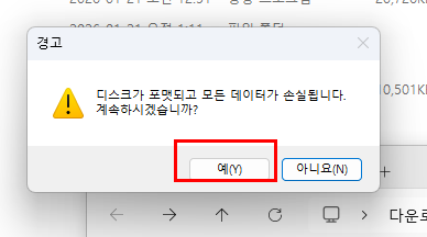 USB를 선택한 뒤 설치 버튼을 누르면 경고 메시지가 뜹니다. "디스크가 포맷되고 모든 데이터가 손실됩니다. 계속하시겠습니까?" USB 안에 중요한 파일이 없는지 반드시 확인한 뒤 예(Y)를 누릅니다.