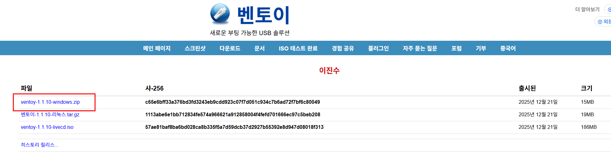 (ventoy.net 공식 사이트 다운로드 페이지. ventoy-1.1.10-windows.zip 파일을 빨간 네모 표시한 부분에서 받습니다.)