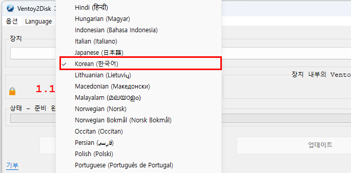 Ventoy2Disk을 실행하면 영문 인터페이스가 기본으로 뜹니다. 상단 메뉴에서 Language → Korean (한국어)를 선택하면 한국어로 바뀝니다.