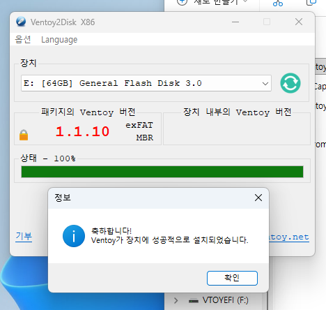 설치는 몇 초면 끝납니다. "축하합니다! Ventoy가 장치에 성공적으로 설치되었습니다."라는 메시지가 뜨면 완료입니다.