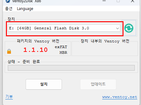 장치 항목에서 Ventoy를 설치할 USB를 선택합니다. 여기서 절대 주의할 점은, 반드시 올바른 USB를 선택해야 합니다. 외장 하드나 다른 저장 장치를 잘못 선택하면 그 안의 데이터가 전부 날아갑니다.