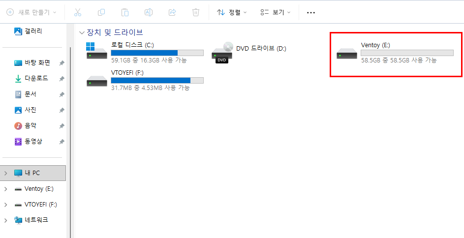 설치가 끝나면 내 PC에서 USB가 두 개의 파티션으로 나뉘어 보입니다. Ventoy라는 이름의 대용량 파티션과, VTOYEFI라는 작은 파티션입니다.